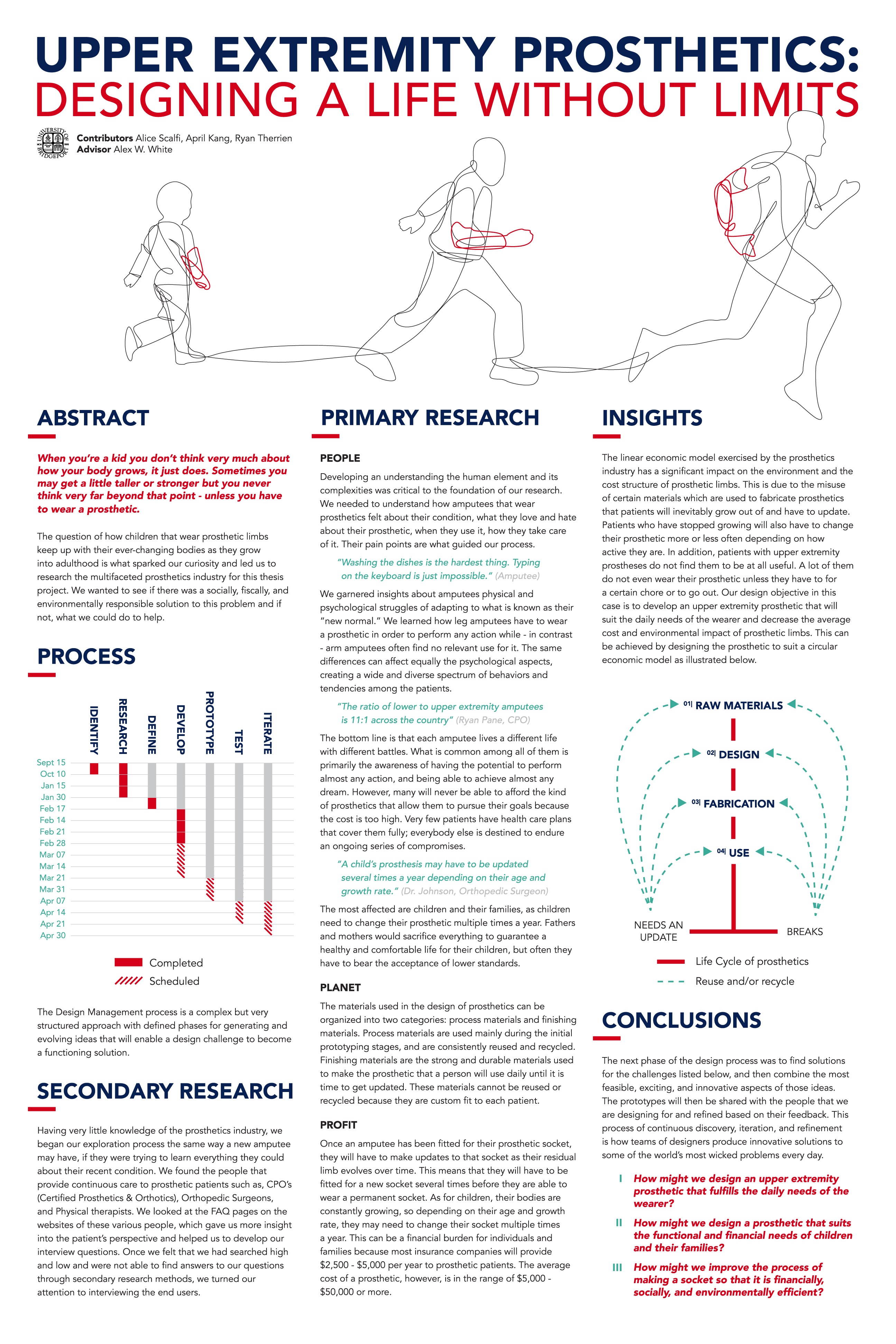 For centuries people have been developing prosthetics that attempt to mimic the anatomical characteristics of the human body rather than focusing on ways to enhance amputees’ quality of life. However, humans have been making simple tools to accomplish tasks that we cannot do with our bare hands since the beginning of recorded history. Why should a prosthetic be any different from the tools designed to accomplish everyday tasks? Our thesis explores this quandary through design thinking and human-centered design, and results in an environmentally, socially, and fiscally responsible solution. ✖