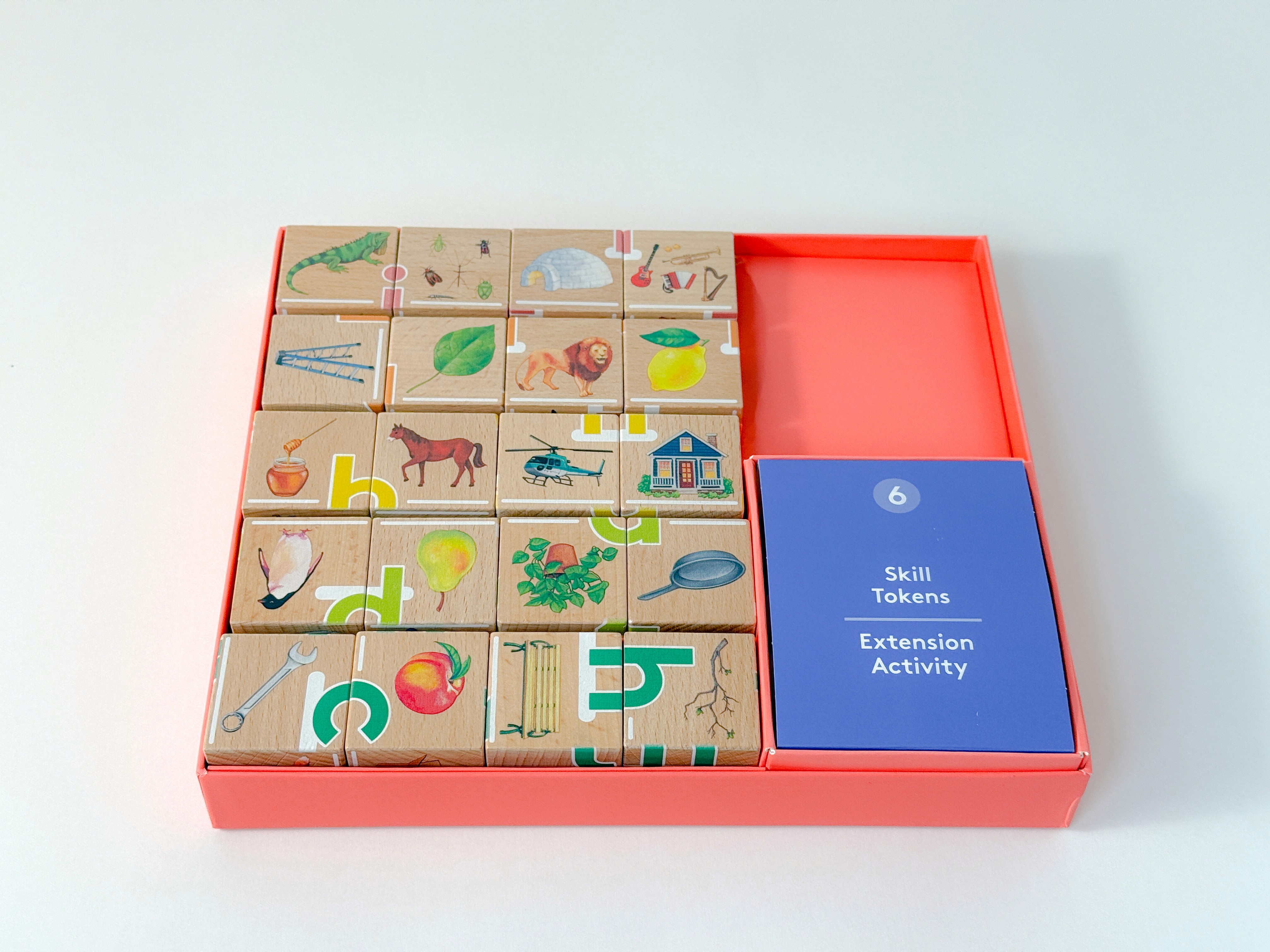 The Wooden Letter Sound Blocks are designed to help children in Pre-K and kindergarten develop their reading skills by teaching them to blend letter sounds. These come with an extension activity called the Skill Tokens, which give kids a chance to test themselves on what they've learned so far.