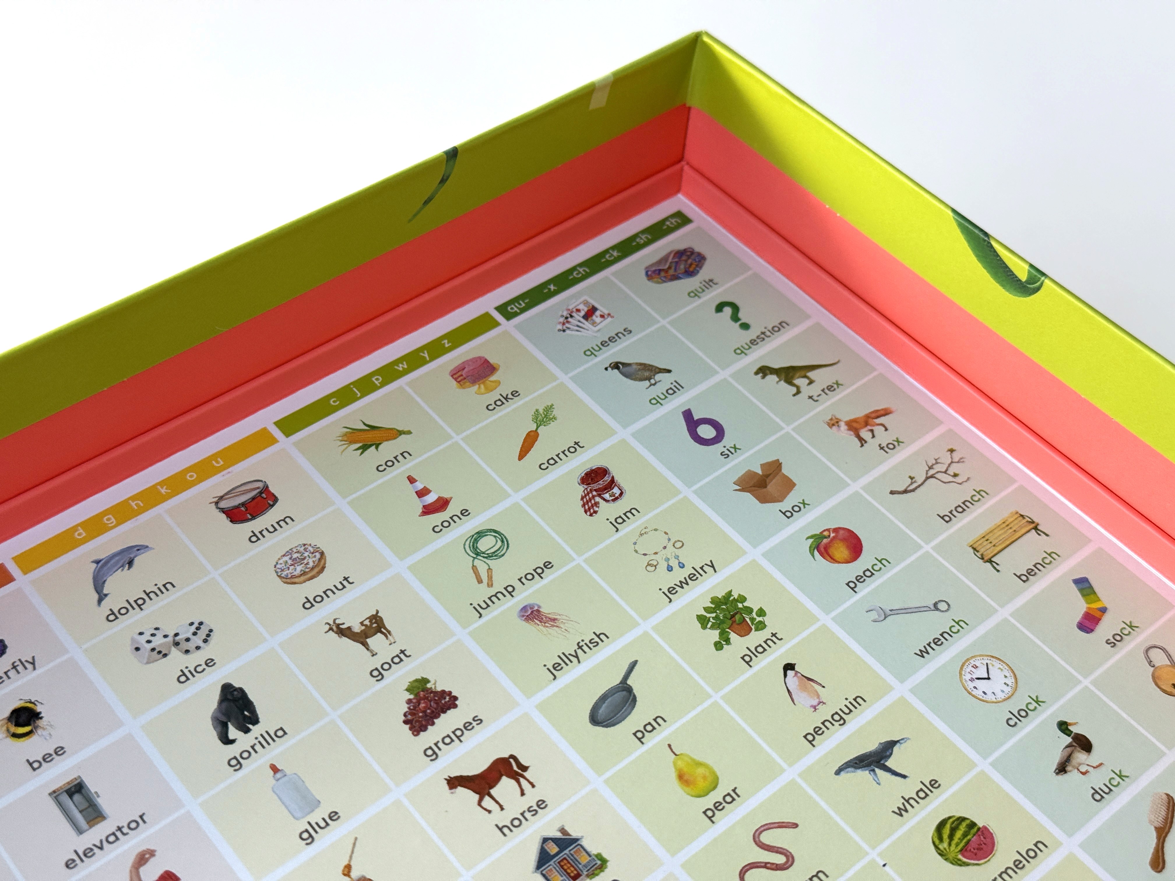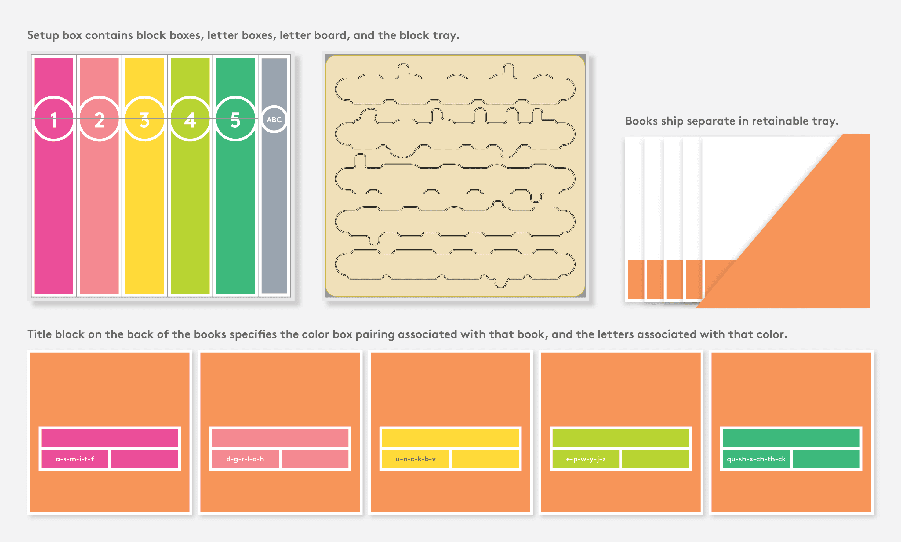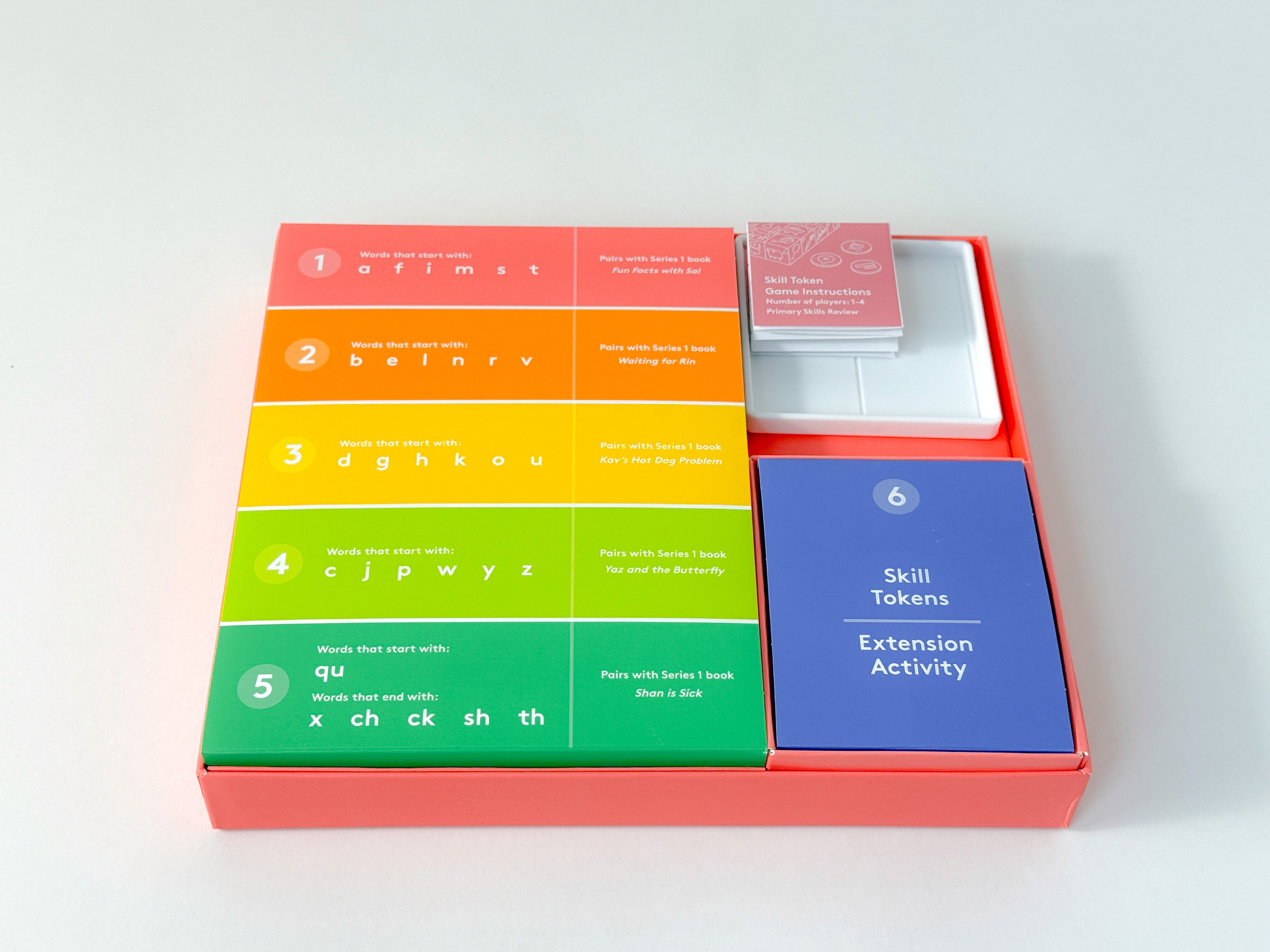 Retained packaging is intended for long term storage and organization. It’s an artifact that people keep alongside the product so it needs to meet the same quality and safety standards as the toys and games it protects. This game presented a unique challenge where several parts of the game were meant to work with parts of the larger group of activities and books that come with The Reading Skill Set.